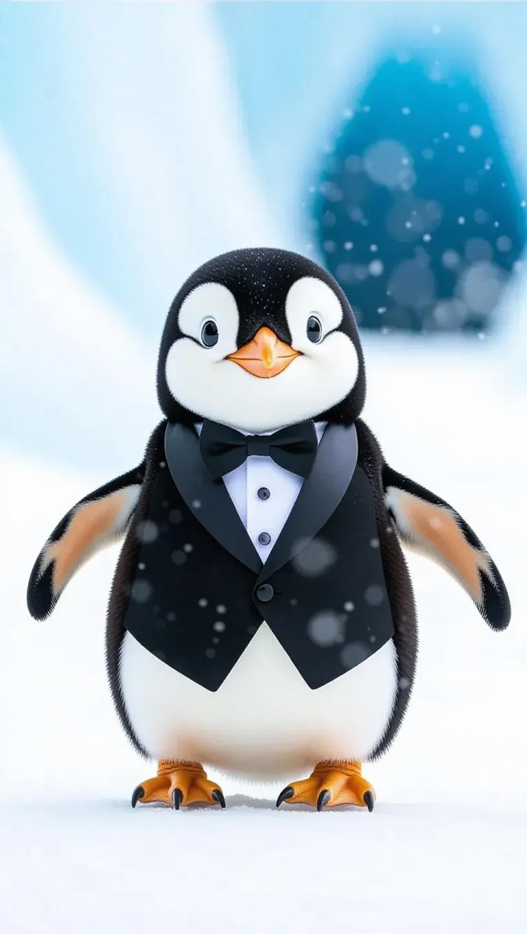 The cute penguin in a tiny tuxedo and bow tie waddles down the snowy runway with a charming smile. It pauses briefly to look around, taking in the icy landscape and towering icebergs. The camera follows the penguin's movements, capturing the playful bounce in its step and the gentle snowfall in the background