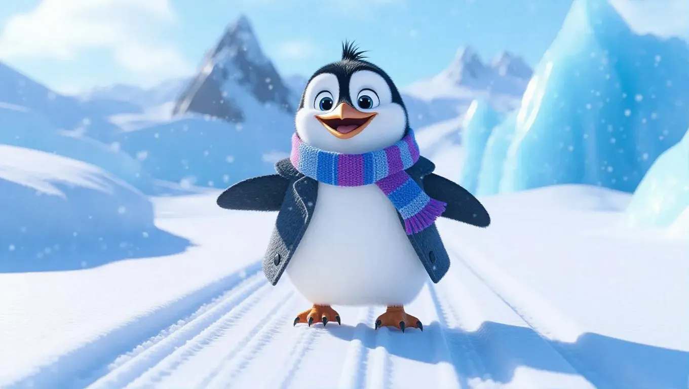 The cheerful penguin dressed in a tiny coat with a scarf waddles joyfully down the snowy runway, with a bright grin. It stops briefly to gaze at the surrounding icy scenery and majestic icebergs. The camera tracks its energetic moves, capturing the lively bounce in its walk amidst the falling snow.
