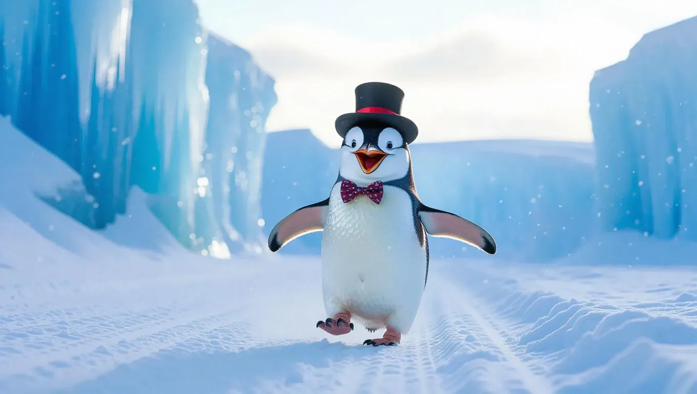 The playful penguin, sporting a tiny top hat and festive bow tie, waddles along the snowy runway with an infectious smile. It stops to peek at the stunning ice landscape and towering ice formations around it. The camera captures the playful bounce in its step along with the delicate flurry of snowflakes falling down.