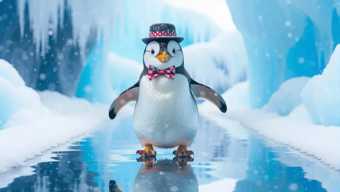 The delightful penguin adorned with a tiny cap and festive bowtie waddles down the glistening runway, beaming with joy. It pauses to survey the frosty scene, delighted with the majestic icebergs. The camera tracks the penguin’s movements closely, catching the cute bounce in its step along with the gentle snowfall.