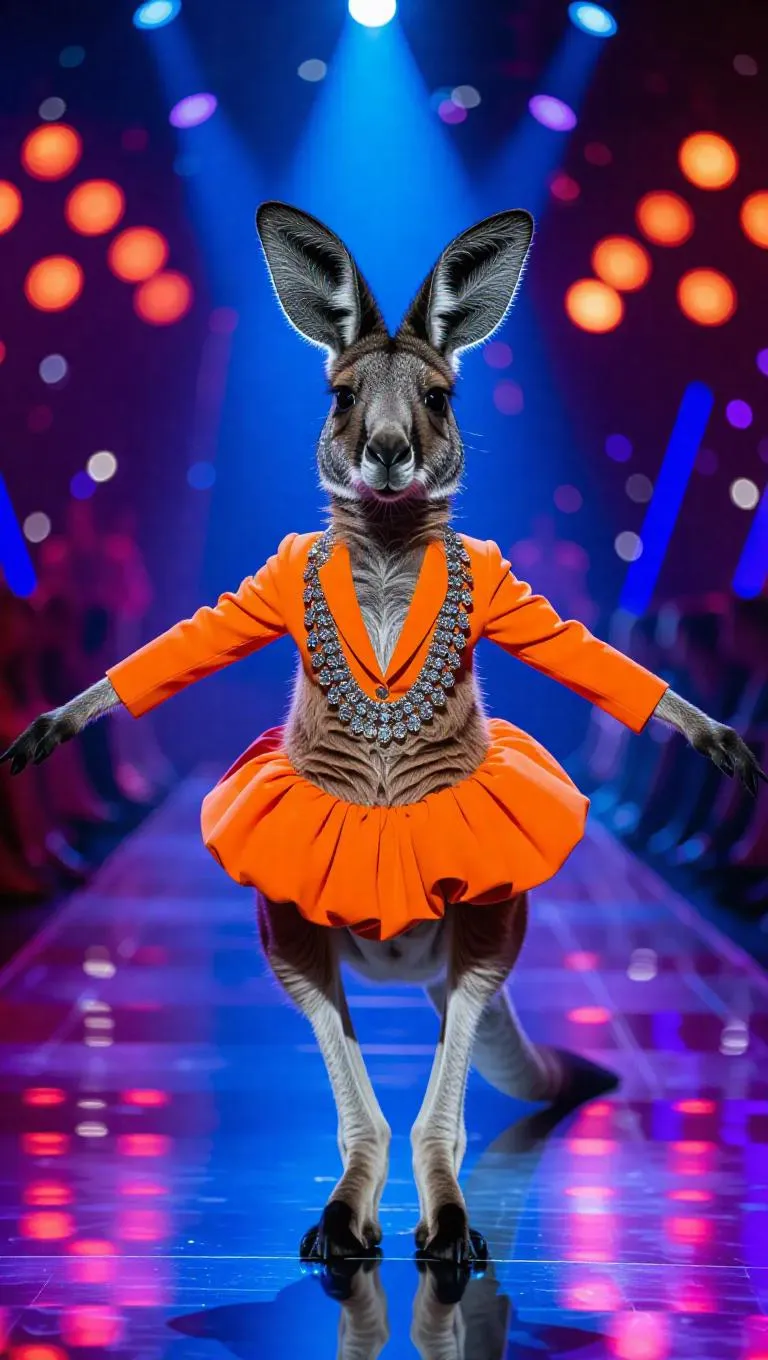 A festive kangaroo bounces down the runway, pouch displayed prominently. It is clad in a fun, orange outfit accessorized with a striking necklace. The kangaroo's animated movements and playful smile make it a showstopper.