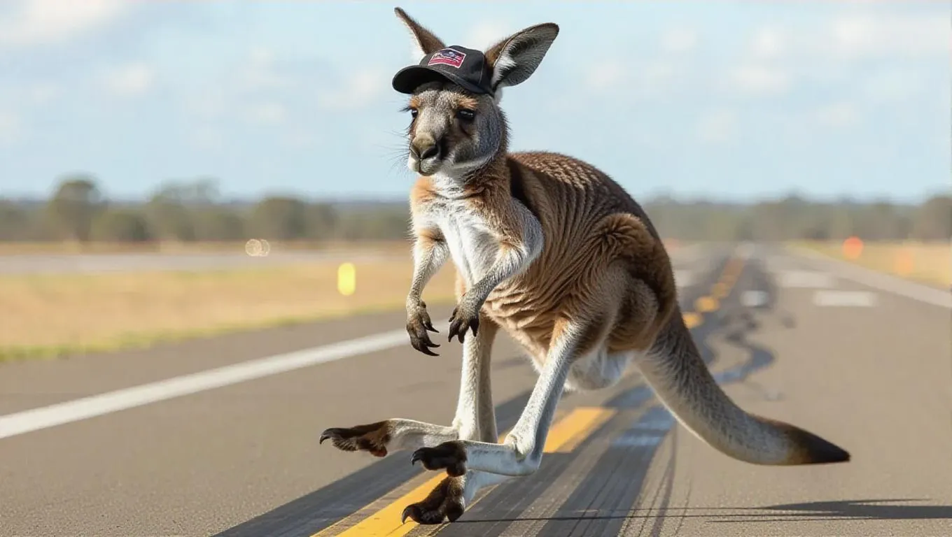 A delightful kangaroo skips across the runway, pouch visible. It sports a funky, black-and-white outfit with a trendy cap. The kangaroo's energetic style and playful expression make it unforgettable.