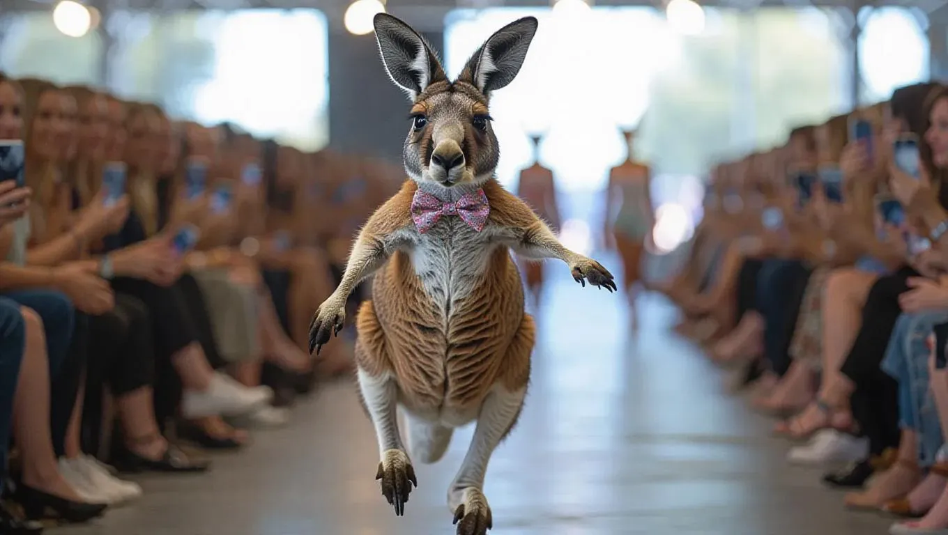 A cheerful kangaroo hops gracefully down the runway, pouch in view. It is dressed in a cozy, pastel outfit accented with a cute bow tie. The kangaroo's lively rhythm and warm smile make it a favorite among attendees.