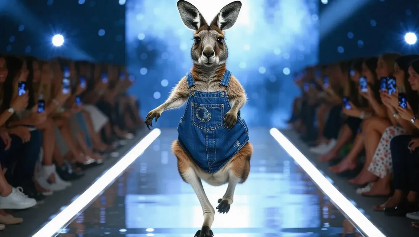 A joyful kangaroo trots down the runway, proudly displaying its pouch. It wears a trendy, denim outfit with stylish patches. The kangaroo's exhilarating actions and bright eyes enchant everyone watching.