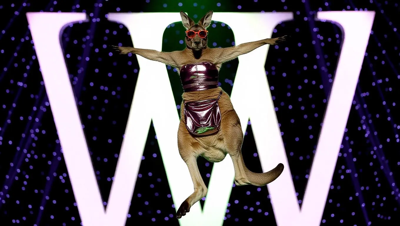 An expressive kangaroo leaps into view on the runway, pouch shown off. Dressed in a shiny, metallic outfit with funky glasses, the kangaroo's spirited presence and joyful demeanor uplift the crowd.