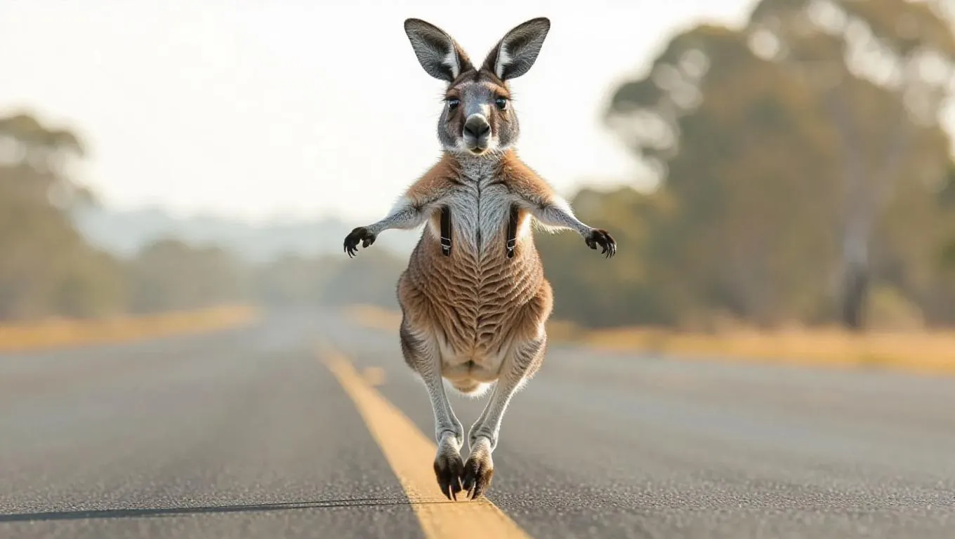 A lively kangaroo hops excitedly down the runway, showcasing its pouch. It is dressed in a classic, vintage outfit complete with suspenders. The kangaroo's energetic hops and cheeky smile endear it to the onlookers.