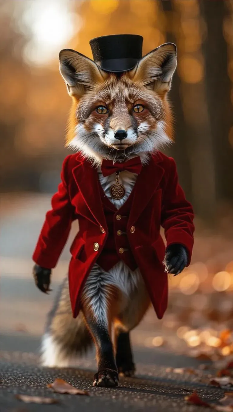 A cunning fox slyly makes its way down the runway with a mischievous grin. It wears a sleek, red velvet jacket and a tiny top hat, giving it a dapper look. The fox's bushy tail sways as it walks, adding to its charm.