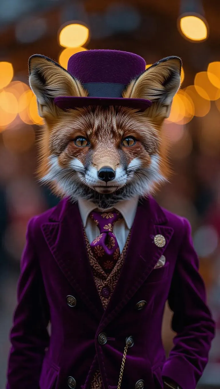 A smart fox stealthily glides along the runway, wearing a playful smirk. Clad in a charming, purple velvet blazer and a tiny trilby, it exudes sophistication. The fox's tail flicks elegantly as it struts, enhancing its appeal.