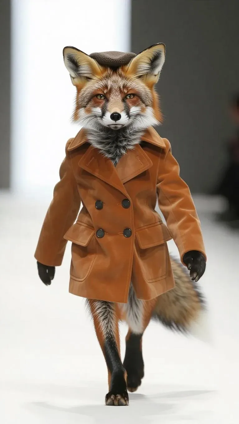 An astute fox slyly walks the runway with a cheeky grin. Adorned in a fashionable, brown suede jacket and a little beret, it boasts style. The fox's bushy tail flows gracefully as it moves, boosting its charm.