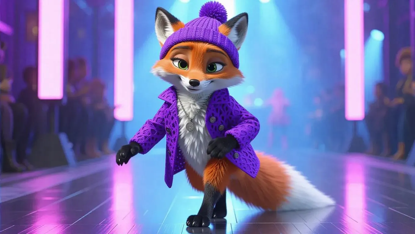 A sly fox makes its way down the runway with a cheeky grin. It showcases a fashionable, lavender lace jacket and a miniature beanie, offering a unique touch. The fox's long tail sways playfully as it struts, contributing to its allure.