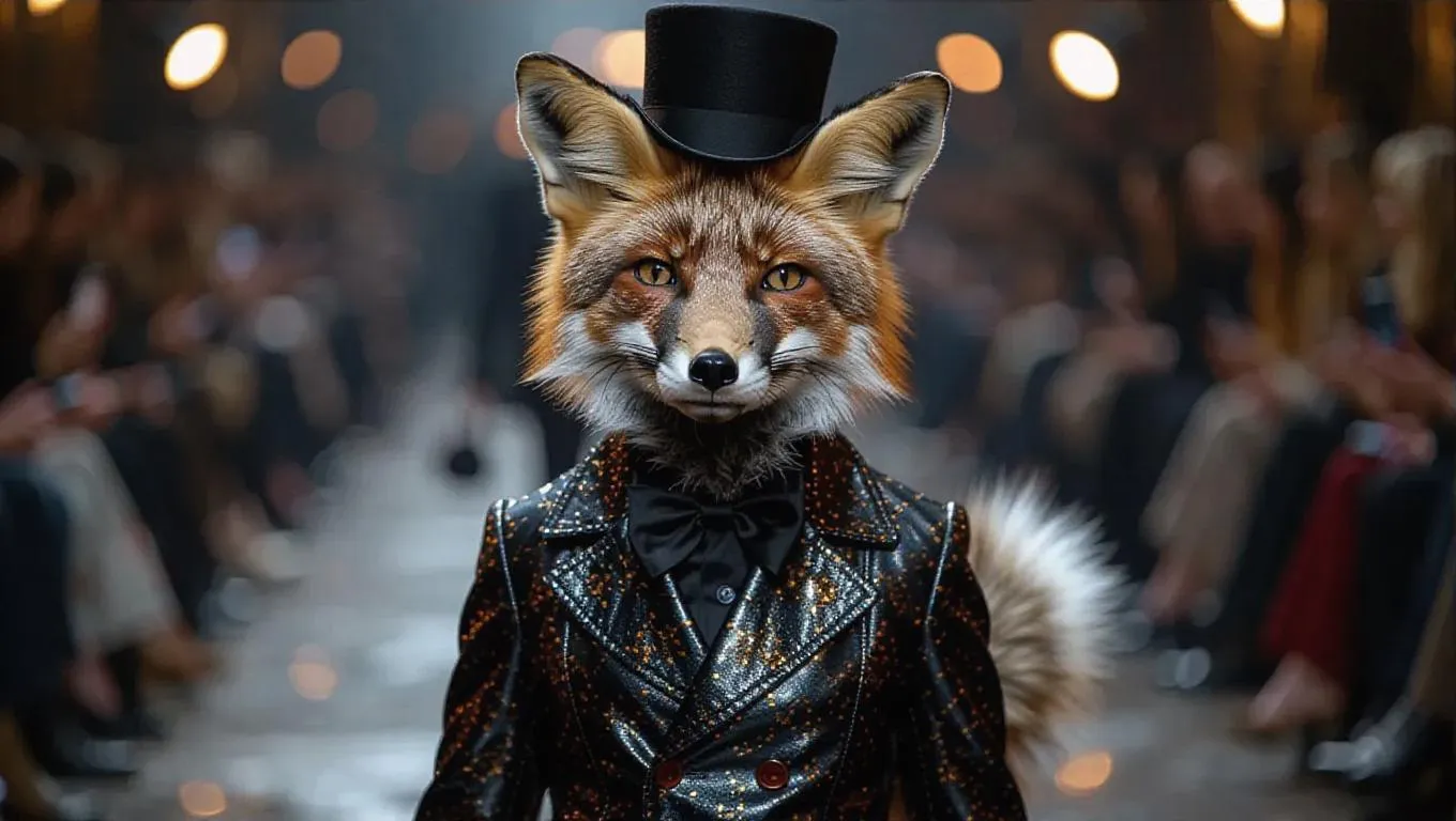 A clever fox confidently struts down the runway with an impish grin. It sports a trendy, metallic silver jacket and a mini bowler hat, showcasing a modern edge. The fox's fluffly tail dances as it walks, contributing to its allure.