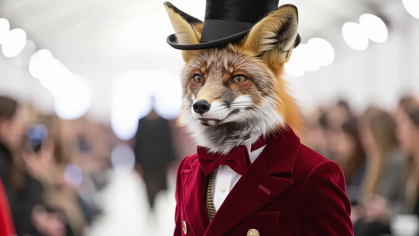 A witty fox elegantly walks the runway with a spirited smile. It is dressed in a rich, burgundy velvet coat and a petite top hat, exuding sophistication. The fox's bushy tail moves gracefully as it struts, further adding to its charm.