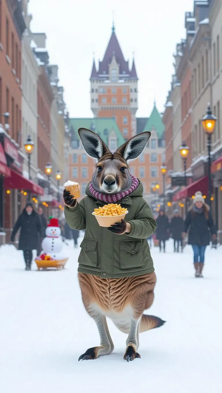 A lively kangaroo hops through the snowy streets of Quebec City, Canada, holding a poutine in one paw. The kangaroo wears a warm parka and a knitted hat, its pouch filled with maple candies. Around it, the historic buildings of Old Quebec rise up, and the streets are filled with sleds and snowmen. In the distance, the Château Frontenac stands tall against the winter landscape. The air is filled with the scent of hot chocolate and the sounds of holiday carols.