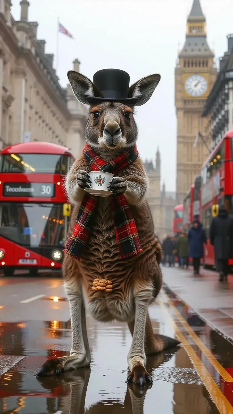 A bold kangaroo hops through the foggy streets of London, England, holding a tea cup in one paw. The kangaroo wears a classic bowler hat and a plaid scarf, its pouch filled with biscuits. Around it, the famous landmarks of the city rise up, and the streets are filled with red buses and people in raincoats. In the distance, Big Ben stands tall, chiming in the afternoon. The air is filled with the scent of fish and chips and the sounds of street performers.