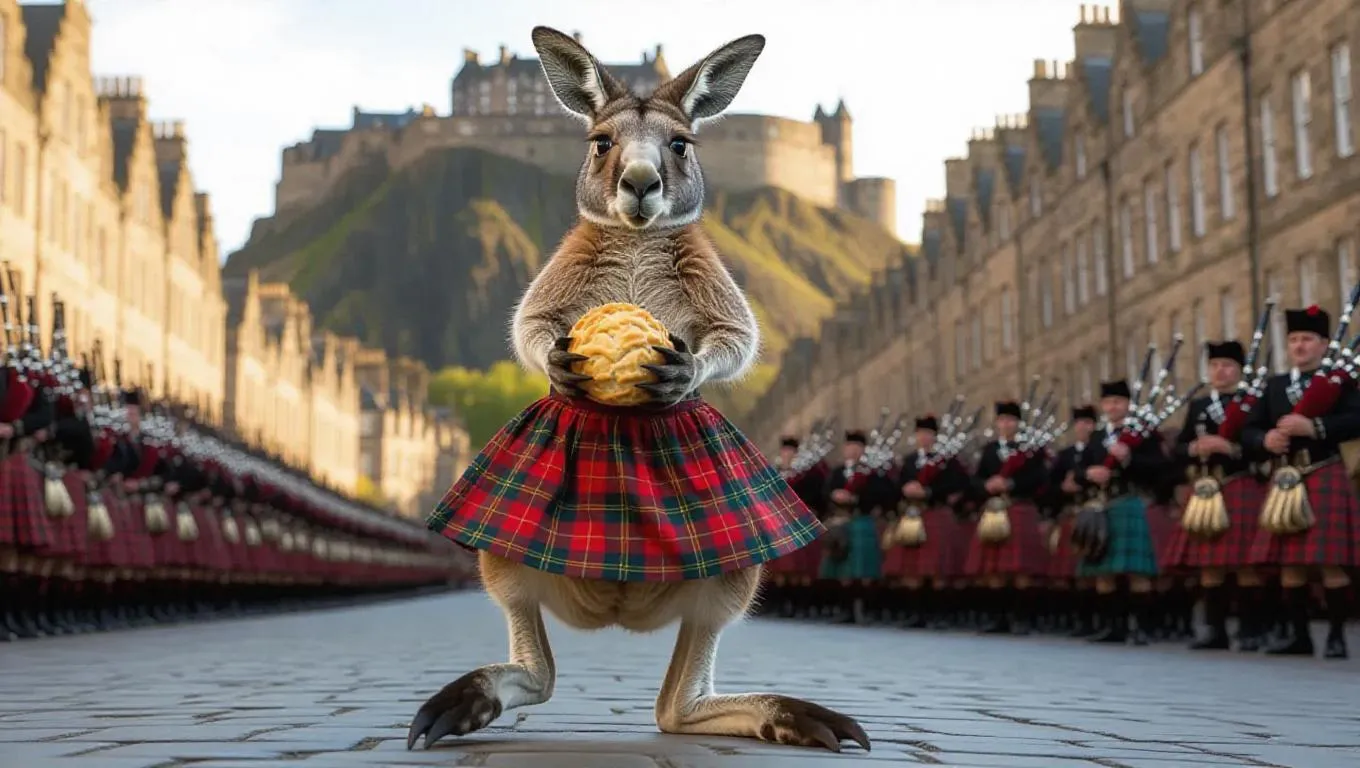 A rustic kangaroo hops through the picturesque streets of Edinburgh, Scotland, holding a haggis in one paw. The kangaroo wears a tartan kilt and a tam o'shanter hat, its pouch filled with shortbread. Around it, the stone castles and rolling hills rise up, and the streets are filled with bagpipers and tourists. In the distance, the Edinburgh Castle stands tall on the hilltop. The air is filled with the scent of whiskey and the sounds of folk music.