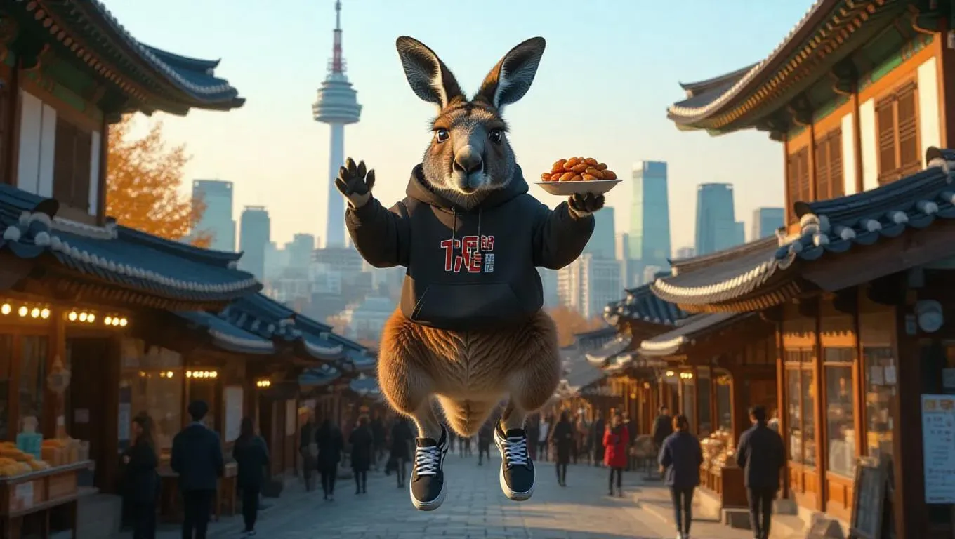 An energetic kangaroo hops through the enticing streets of Seoul, South Korea, holding a tteokbokki in one paw. The kangaroo wears a trendy hoodie and stylish sneakers, its pouch filled with kimbap. Around it, the modern skyscrapers and traditional palaces rise up, and the streets are filled with fashion-forward individuals and food stalls. In the distance, Namsan Tower stands tall, lighting up the skyline. The air is filled with the scent of street food and the sounds of K-pop music.