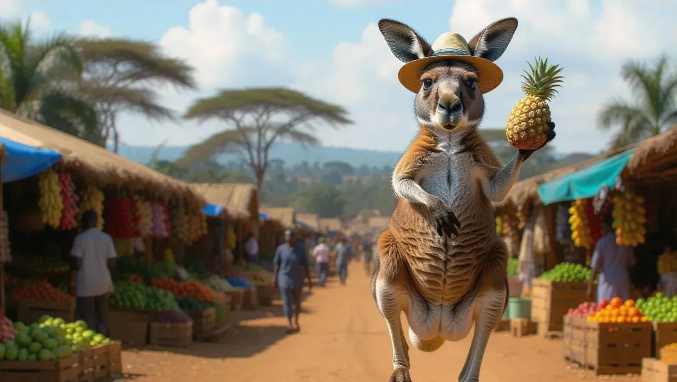 An adventurous kangaroo hops through the lush streets of Nairobi, Kenya, holding a matoke in one paw. The kangaroo wears a safari outfit and a wide-brimmed hat, its pouch filled with fresh fruit. Around it, the vibrant markets and wildlife art rise up, and the streets are filled with vendors and tourists. In the distance, the Nairobi National Park stands tall, with wildlife visible in the distance. The air is filled with the scent of African spices and the sounds of nature.