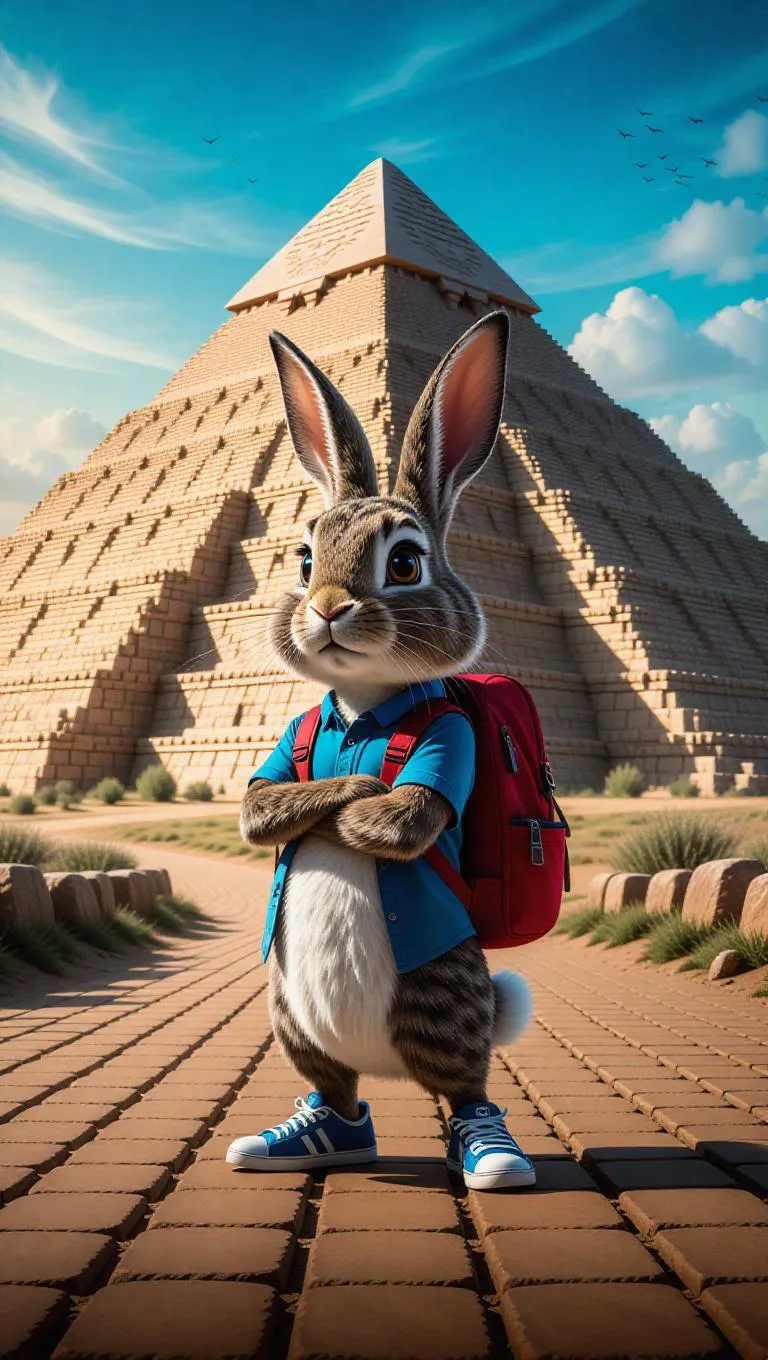 A cartoon rabbit stands confidently on a brick road, holding a red backpack. The rabbit's blue shirt and sneakers contrast with the earthy tones of its surroundings. Behind the rabbit, a large stone wall stretches across the scene, and beyond it, an ancient pyramid looms over the landscape. The pyramid, with its distinct cone shape, stands as a testament to a past civilization. The sky above is painted in shades of blue, suggesting a clear and sunny day, with a flock of birds flying overhead.