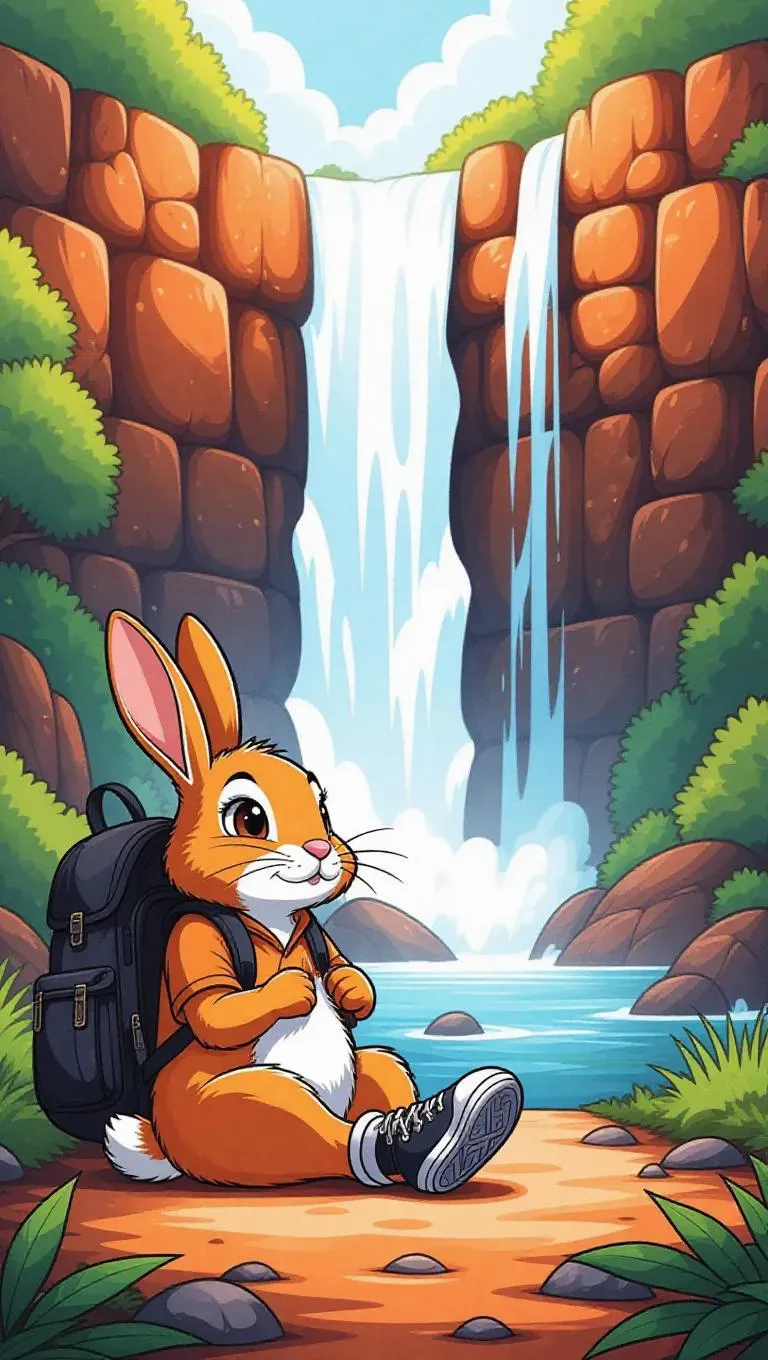 A cartoon rabbit rests comfortably on a winding path, holding a black backpack. The rabbit's orange shirt and high-top sneakers blend with the rich colors of its surroundings. Behind the rabbit, an old brick wall stretches across the scene, and beyond it, an enormous waterfall cascades down into a sparkling river. The waterfall, with its roaring sound, captivates visitors. The sky above is painted in shades of gray, suggesting an overcast day, with raindrops beginning to fall.
