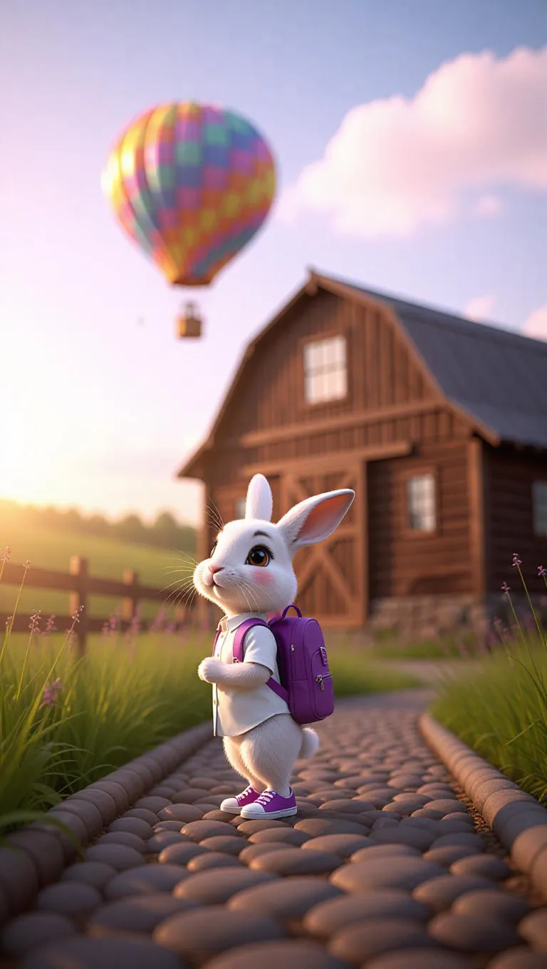 A cartoon rabbit stands curiously on a pebble path, holding a purple backpack. The rabbit's white shirt and loafers stand out against the earthy tones of its surroundings. Behind the rabbit, a large wooden barn stretches across the scene, and beyond it, a colorful hot air balloon floats gracefully. The balloon, with its bright patterns, adds a whimsical touch to the atmosphere. The sky above is painted in soft pastels, suggesting early morning, with the sun peeking through.
