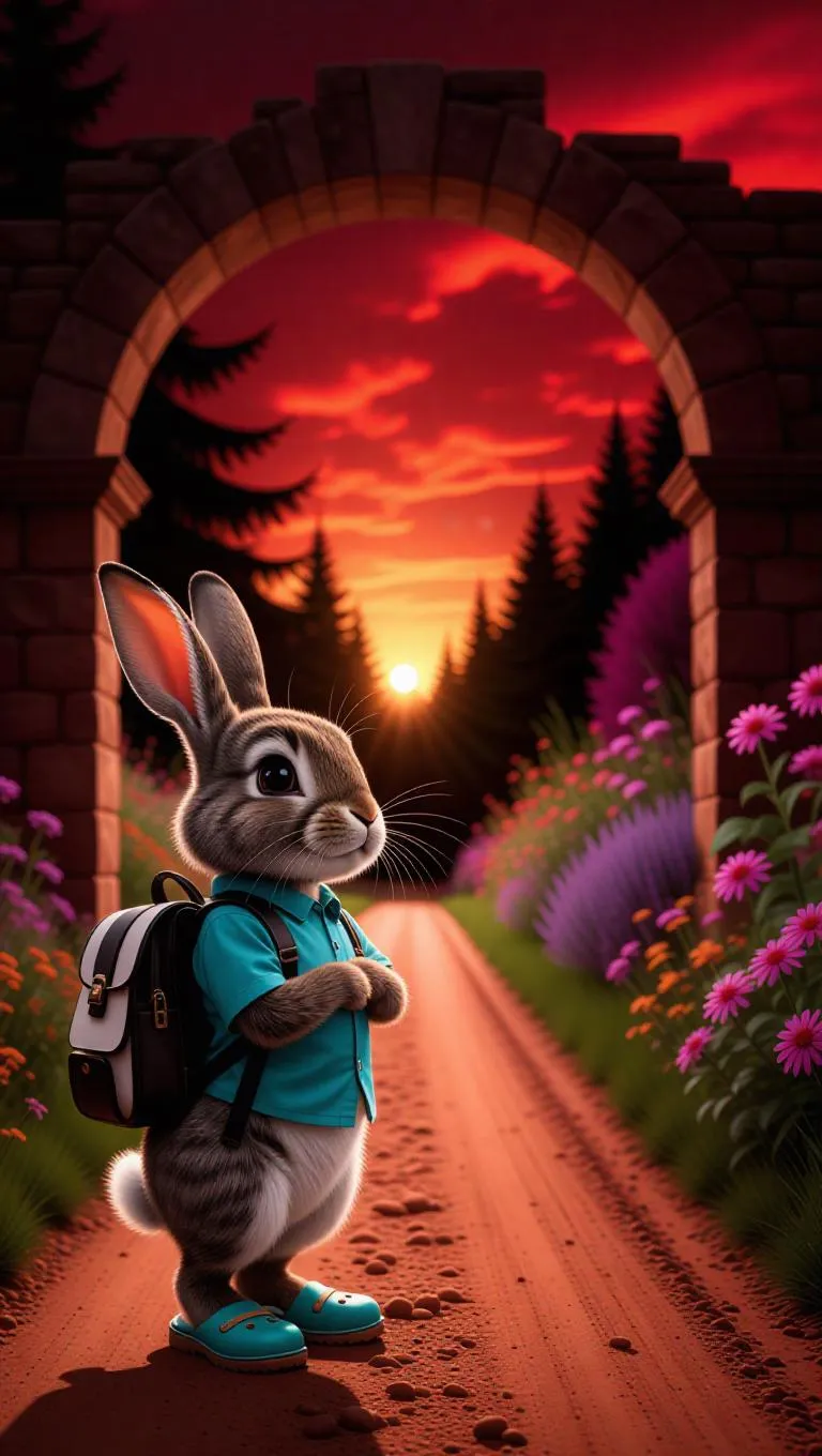 A cartoon rabbit gazes thoughtfully on a dirt road, holding a black and white backpack. The rabbit's teal shirt and clogs contrast with the dull browns of its surroundings. Behind the rabbit, a crumbling stone archway stretches across the scene, and beyond it, a lush garden bursts with colors. The garden, filled with blooming flowers, radiates life. The sky above is painted in vibrant reds, suggesting a dramatic sunset, with silhouetted trees in the foreground.