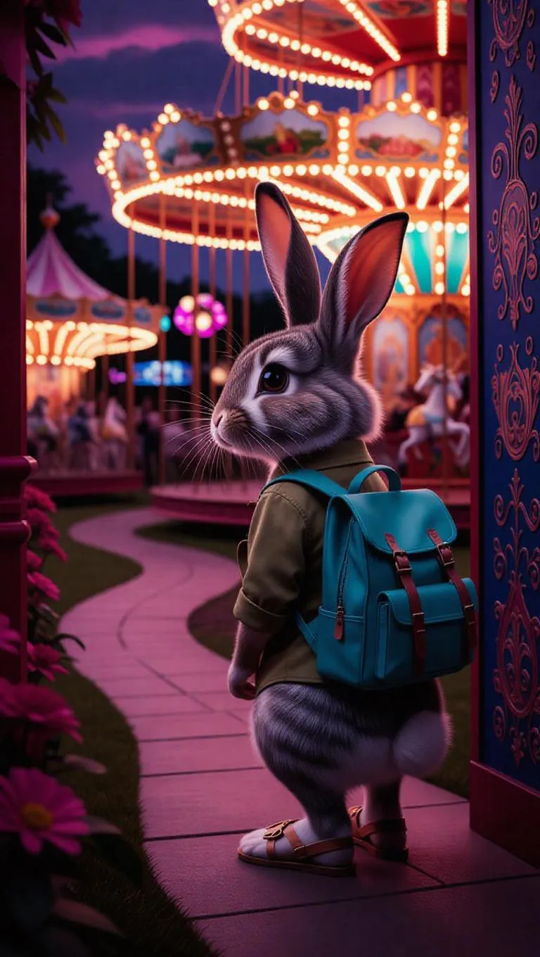 A cartoon rabbit peers curiously at a winding path, holding a turquoise backpack. The rabbit's olive shirt and buckled sandals contrast with the soft pastels of its surroundings. Behind the rabbit, a series of colorful murals adorns the wall nearby, and beyond it, a fantastic carousel spins playfully. The carousel, with its dazzling lights, dazzles onlookers. The sky above is painted in deep violets, suggesting a festive evening, with music drifting through the air.