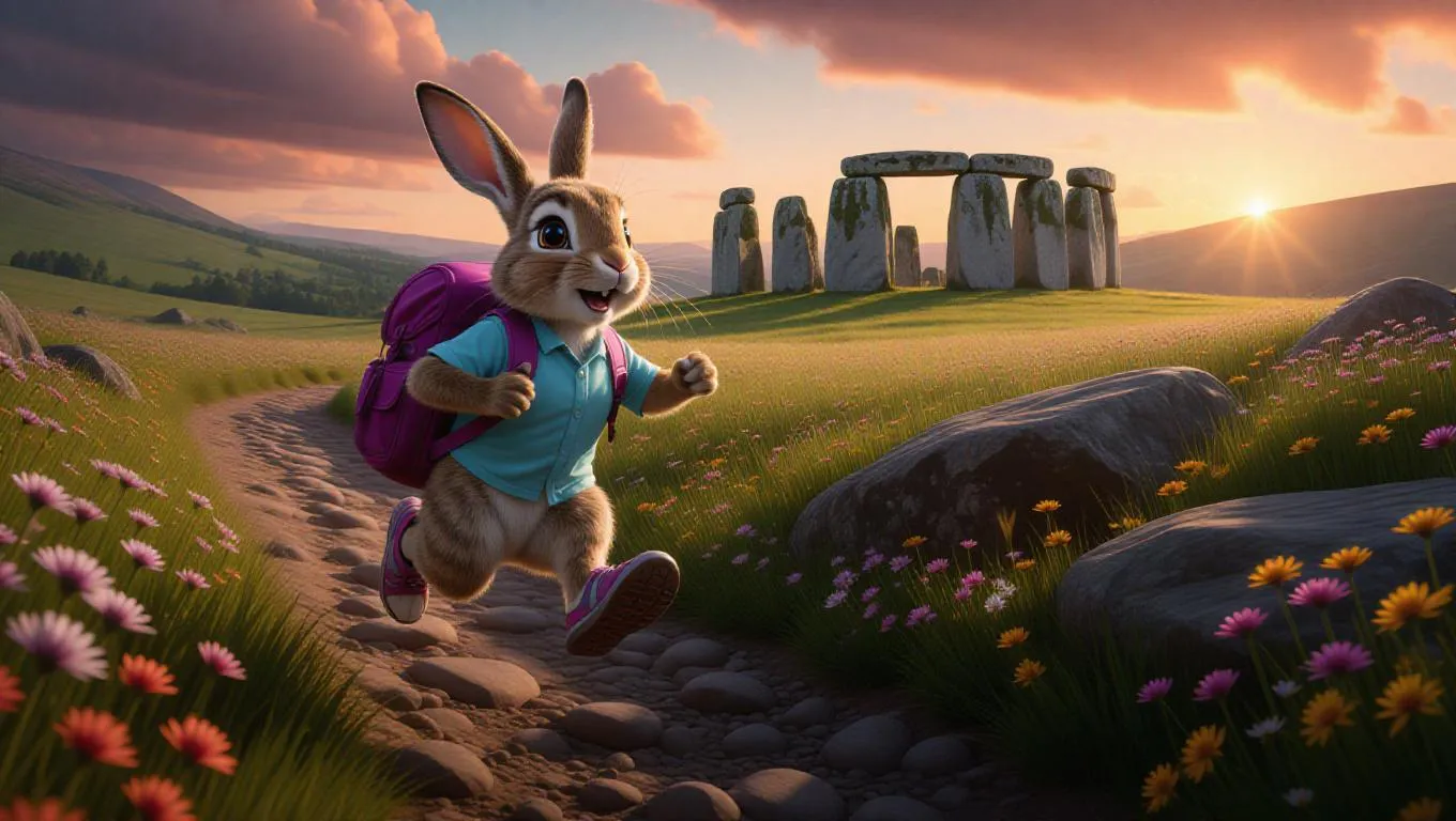 A cartoon rabbit leaps playfully on a rocky trail, holding a berry-colored backpack. The rabbit's light blue shirt and sporty sandals stand out against the muted greys of its surroundings. Behind the rabbit, an ancient stone circle looms mystically, and beyond it, a sprawling meadow stretches into the horizon. The meadow, carpeted in wildflowers, captivates the eye. The sky above is painted in fiery oranges, suggesting early evening, with the sun bidding farewell.