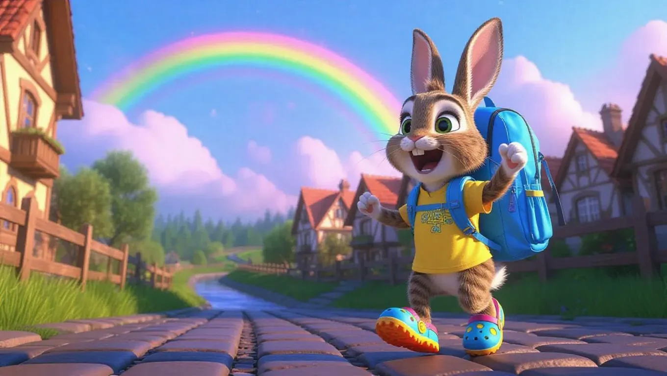 A cartoon rabbit bounces excitedly on a cobblestone road, holding a sky-blue backpack. The rabbit's bright yellow shirt and colorful crocs contrast with the grey tones of its surroundings. Behind the rabbit, a crystal-clear stream winds through the scene, and beyond it, an enormous rainbow arcs gracefully across the sky. The rainbow, a vivid display of colors, enchants everyone who sees it. The sky above shimmers in twilight shades, hinting at evening magic.