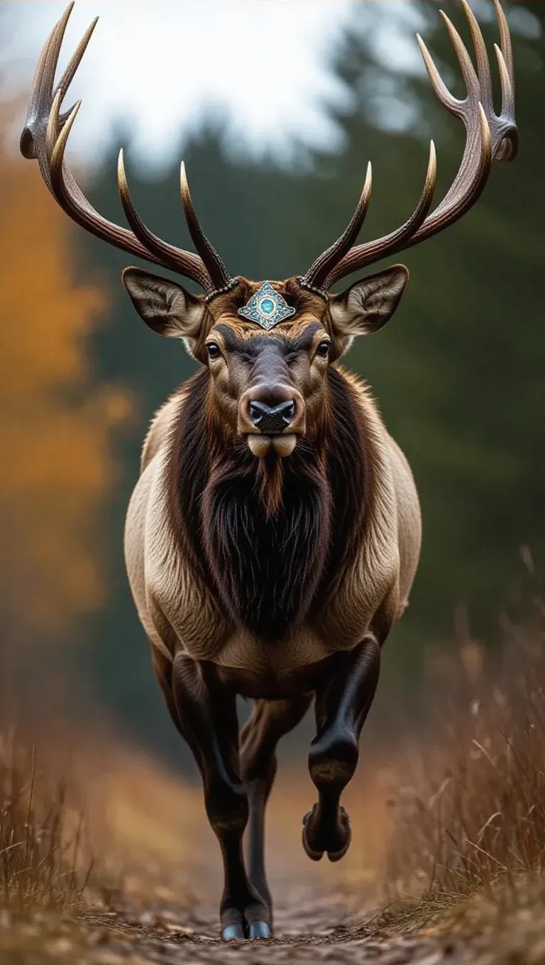 A bold elk steps powerfully down the runway, its massive antlers reaching outward. It flaunts a rugged, dark brown coat and a bold metallic headpiece. The elk's fierce gaze and determined stance display strength.