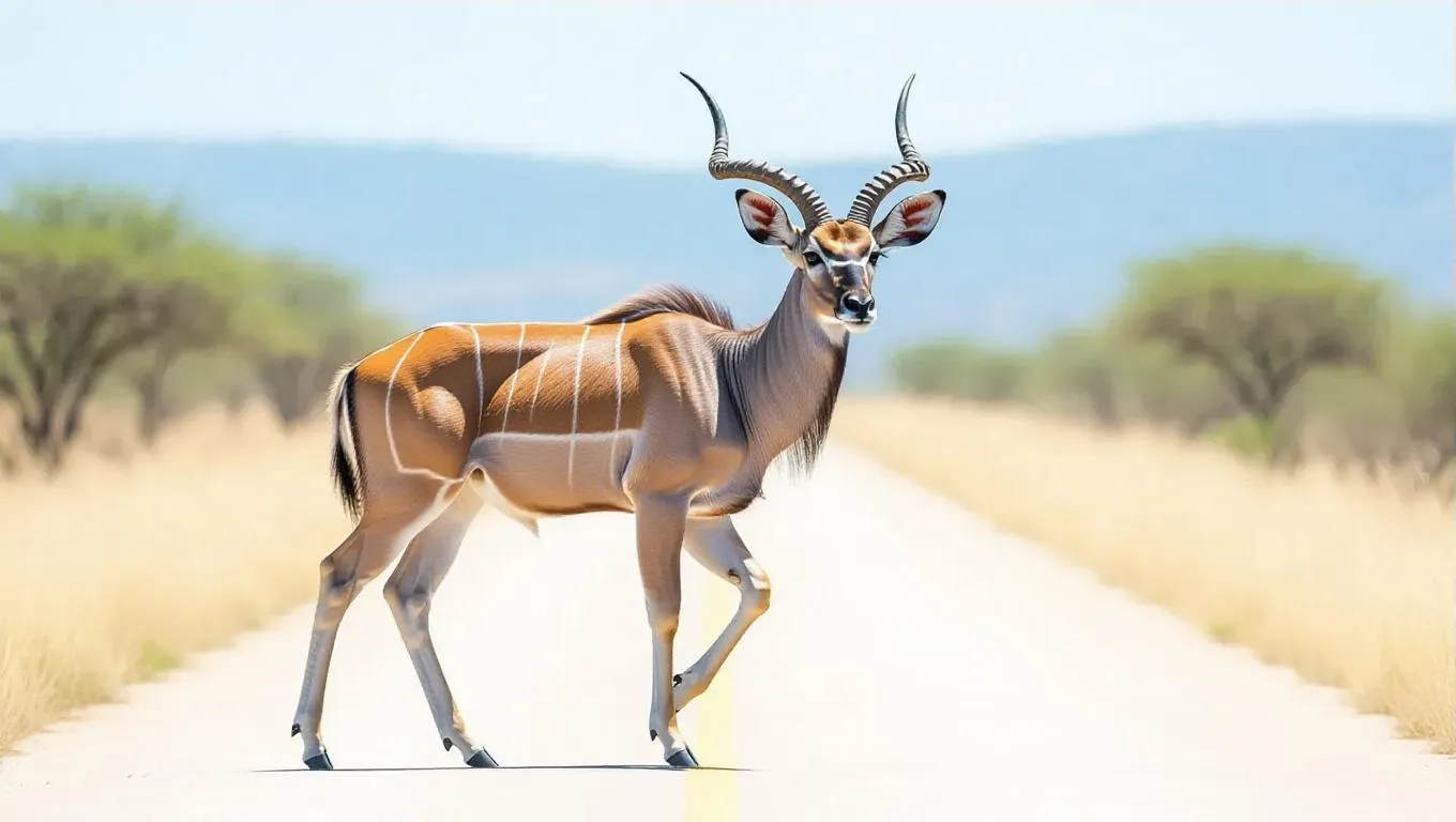 A vibrant kudu roams down the runway, its majestic twisted horns prominent. It showcases a bright patchy coat with stunning line patterns. The kudu's calm eyes and elegant stance portray sophistication.