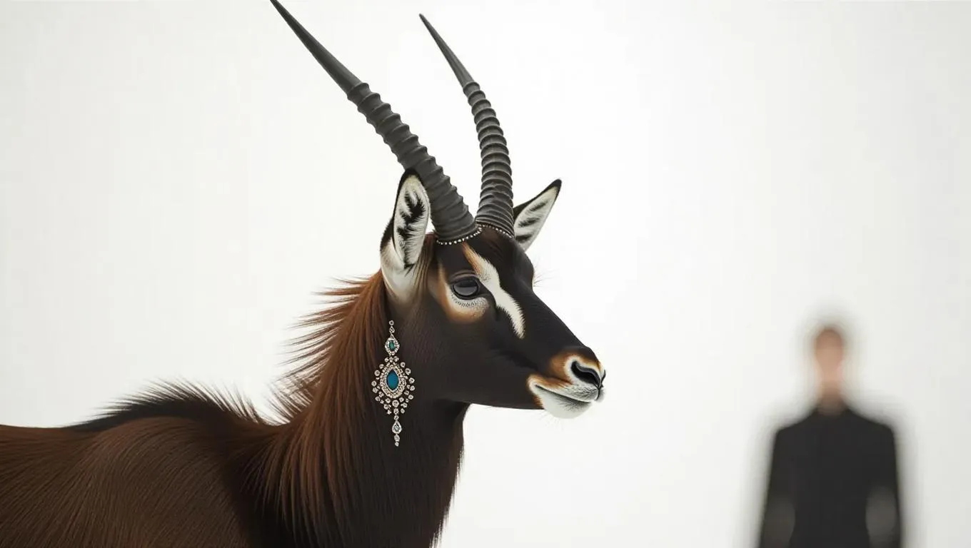 An exquisite sable antelope strolls down the runway, its long, sweeping horns glistening. It showcases a rich, dark brown coat and a jeweled ear cuff. The sable's sharp gaze and confident posture highlight magnificence.