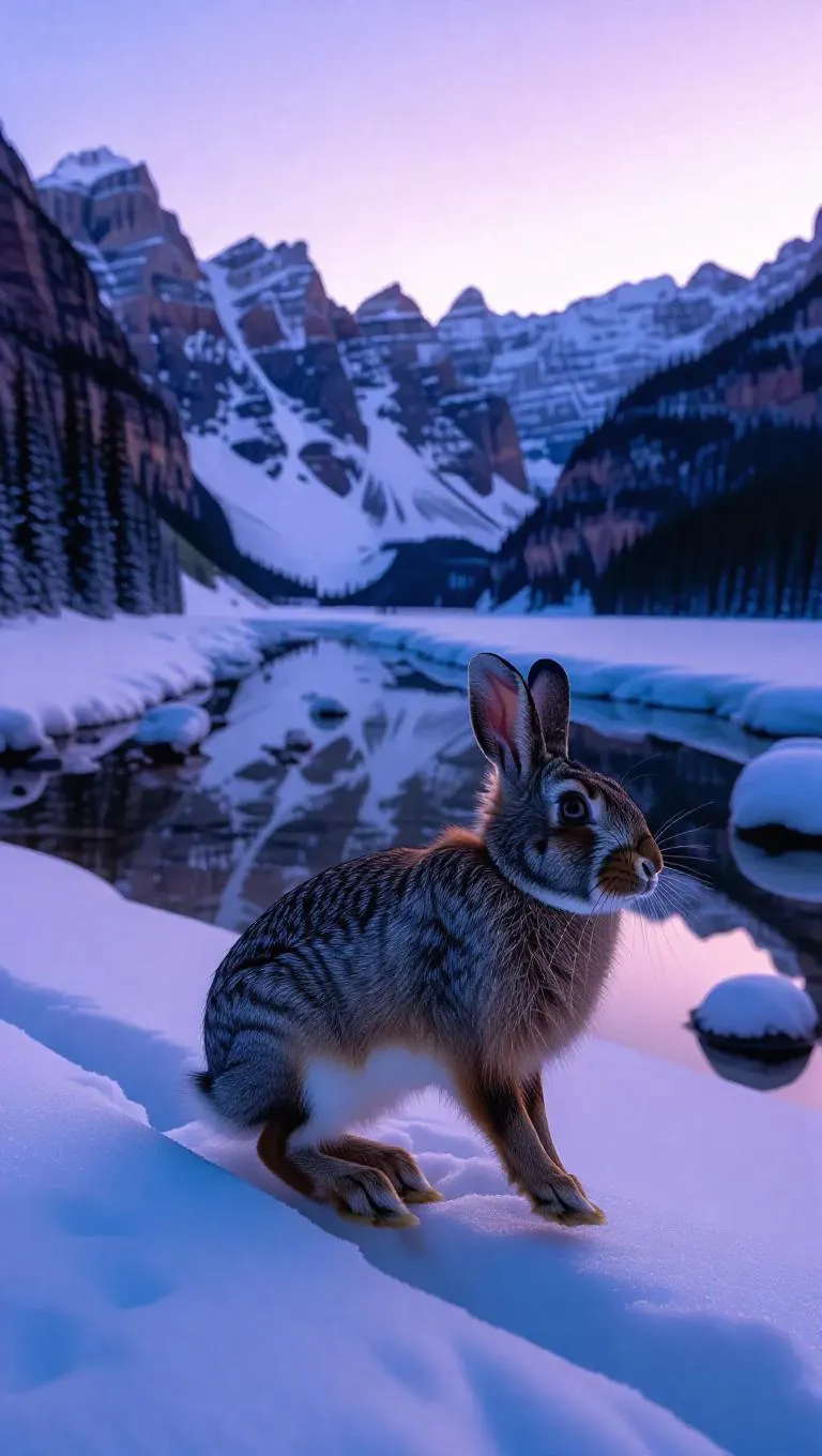 A wandering snowshoe hare hops through the snowy landscapes of the Canadian Rockies, its fur merging with the white snow. The hare wears a warm parka and boots, its breath visible in the frosty air. Behind it, towering mountains and glaciers rise up, their surfaces shimmering under the starlight. In the distance, a small stream reflects the purple sky, its waters clear and tranquil. The air is crisp and filled with the scent of juniper trees.