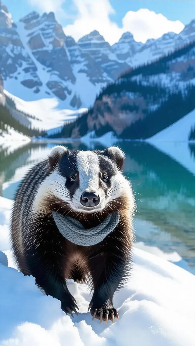 An adventurous badger roams through the snowy landscapes of the Canadian Rockies, its fur blending with the white snow. The badger wears a thick fur coat and a scarf, its breath visible in the frosty air. Behind it, steep mountains and glaciers rise up, their surfaces sparkling in the bright sun. In the distance, a small bay reflects the clear sky, its waters calm and tranquil. The air is crisp and filled with the scent of spruce trees.