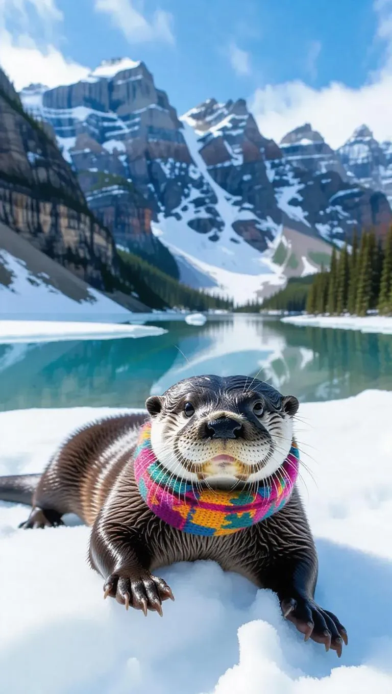 A playful otter slides through the snowy landscapes of the Canadian Rockies, its fur blending with the white snow. The otter wears a thick fur coat and a vibrant scarf, its breath visible in the brisk air. Behind it, majestic mountains and glaciers rise up, their surfaces sparkling under the afternoon sun. In the distance, a small lagoon reflects the blue sky, its waters calm and inviting. The air is crisp and filled with the scent of pine trees.
