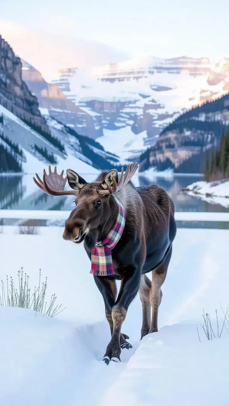 A gentle moose walks through the snowy landscapes of the Canadian Rockies, its fur blending with the white snow. The moose sports a thick fur coat and a plaid scarf, its breath visible in the cold air. Behind it, imposing mountains and glaciers rise up, their surfaces reflecting the sunlight. In the distance, a small reservoir mirrors the dusky sky, its waters still and serene. The air is crisp and filled with the scent of wildflowers.