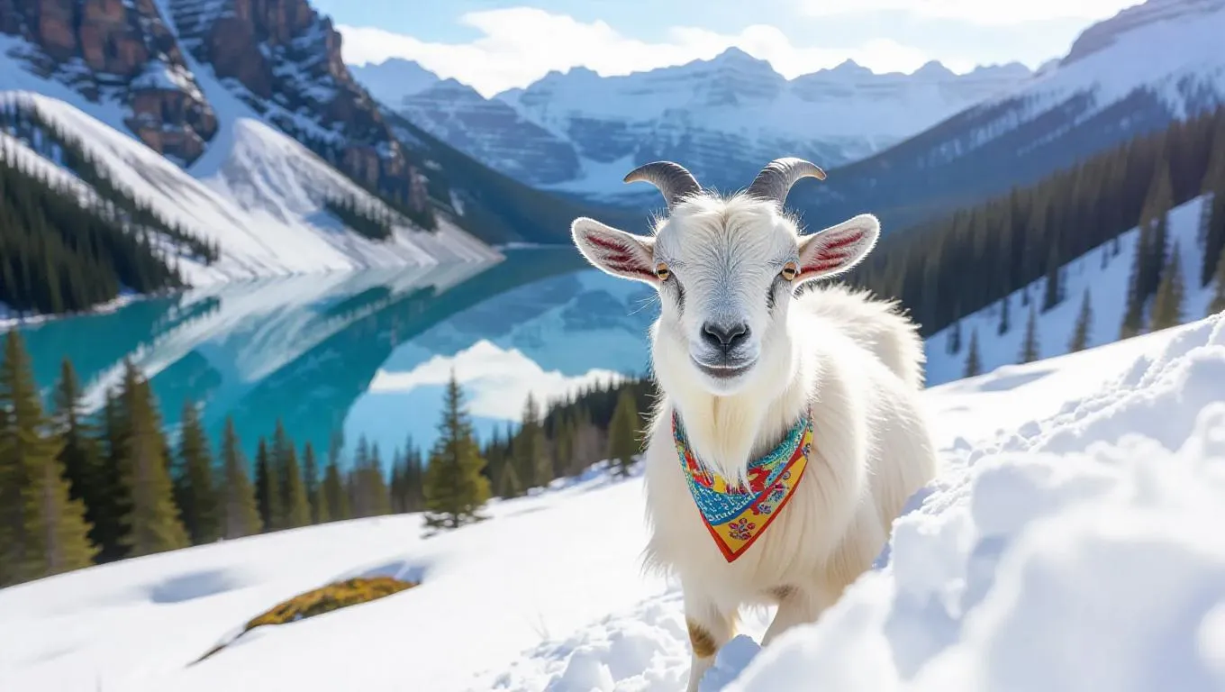 A curious goat climbs through the snowy landscapes of the Canadian Rockies, its fur contrasting with the white snow. The goat is adorned with a thick fur coat and a colorful bandana, its breath visible in the cold air. Behind it, steep mountains and glaciers rise up, their surfaces glimmering under the sun. In the distance, a small glacier lake reflects the pure sky, its waters tranquil and inviting. The air is crisp and filled with the scent of moss.