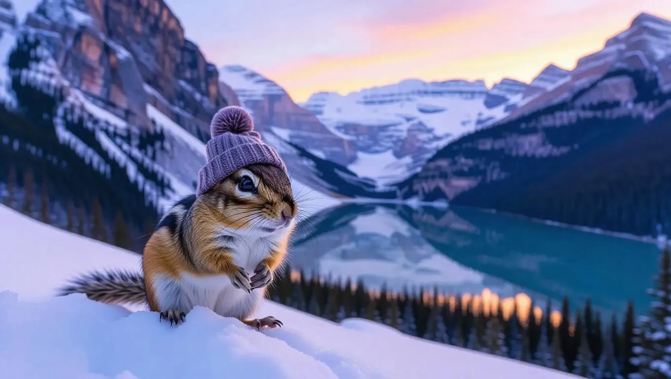 An agile chipmunk scurries through the snowy landscapes of the Canadian Rockies, its fur merging with the white snow. The chipmunk wears a tiny fur coat and a knit cap, its breath visible in the chilly air. Behind it, steep mountains and glaciers tower, their surfaces shimmering in the fading sunlight. In the distance, a small lake mirrors the colorful sky, its waters inviting and still. The air is crisp and filled with the scent of fir.
