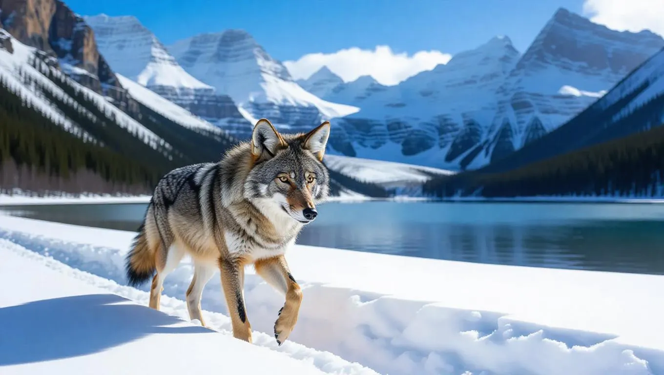 An inquisitive coyote trots through the snowy landscapes of the Canadian Rockies, its fur contrasting sharply with the white snow. The coyote is dressed in a thick fur coat and a cozy hood, its breath visible in the icy atmosphere. Behind it, rugged peaks and glaciers rise majestically, their surfaces radiant with daylight. In the distance, a calm lake reflects the bright blue sky, its surface undisturbed and peaceful. The air is crisp and filled with the scent of nature's freshness.