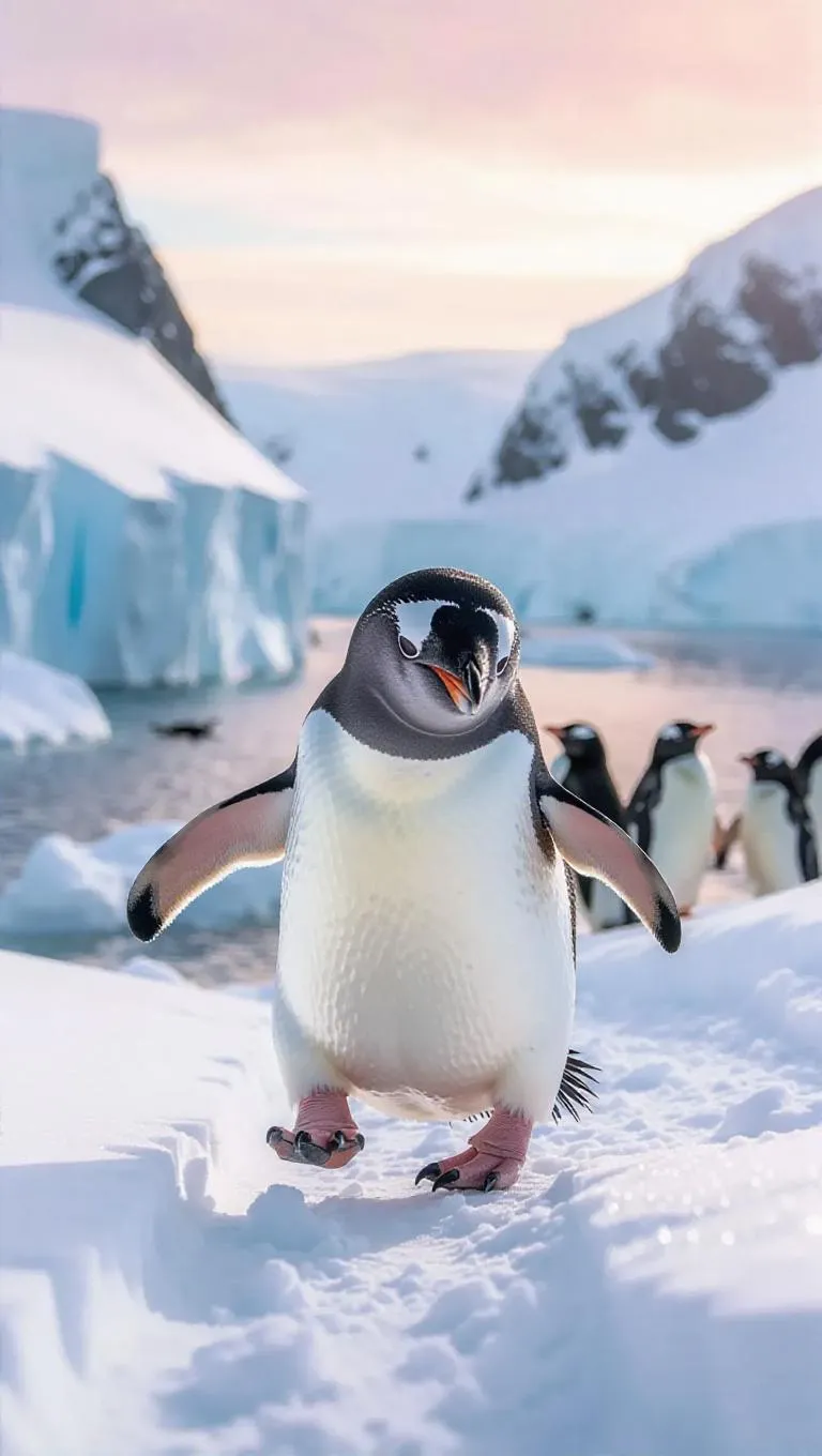 A playful penguin waddles through the snowy landscapes of Antarctica, its black and white feathers contrasting with the white snow. The penguin wears a small scarf and a pair of boots, its movements clumsy yet endearing. Around it, icy cliffs and frozen waters stretch out, their surfaces glistening in the sunlight. In the distance, a small group of penguins huddles together, their calls echoing through the cold air. The sky is painted in shades of pink and orange, creating a stunning backdrop.