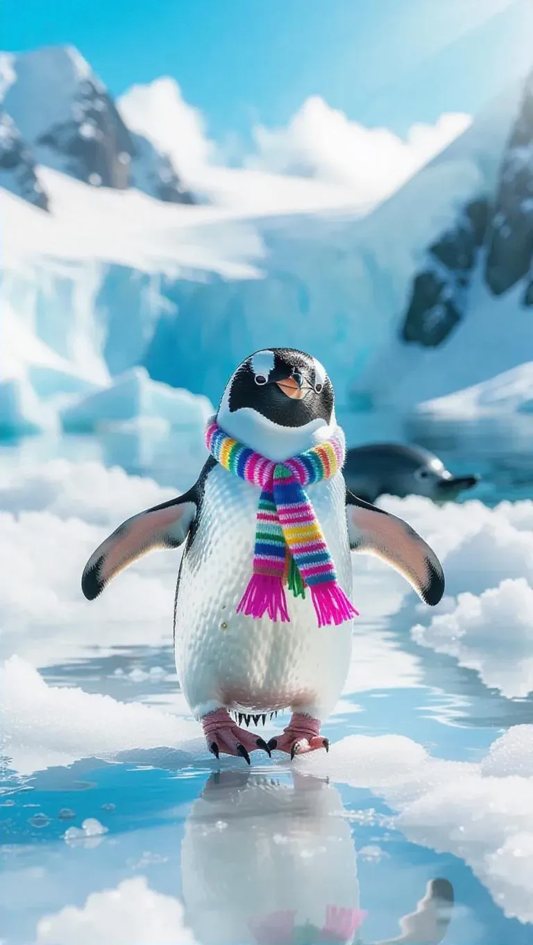 A joyful penguin waddles across the frosty terrains of Antarctica, its black and white plumage contrasting with the crystalline snow. The penguin sports a colorful scarf and tiny shoes, its actions clumsy yet delightful. Scenic frozen cliffs and shimmering ice patches stretch nearby, reflecting the rays of the afternoon sun. In the background, a solitary seal swims gracefully, its splashes audible in the stillness. The sky is a brilliant hue of teal and lavender, enhancing the magical landscape.