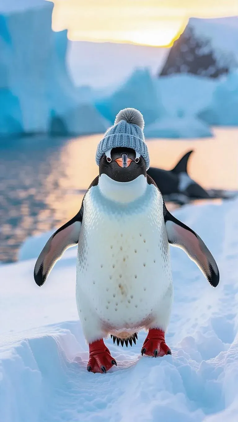 An adventurous penguin hops through the snowy fields of Antarctica, its distinctive black and white feathers highlighted against the blanket of snow. The penguin wears a knitted hat and bright red boots, its clumsy strides very endearing. Enormous glaciers and icy waters surround it, their surfaces catching the sunlight beautifully. In the distance, a lone orca breaches the surface, its call resonating in the wintry air. The sky glows in fiery red and yellow, creating a breathtaking vista.