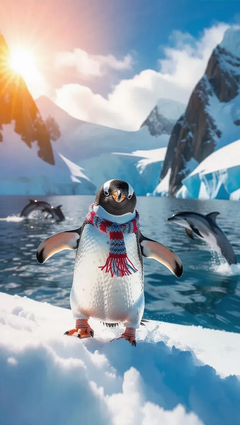A jubilant penguin flops through the snowy reaches of Antarctica, its contrasting black and white colors distinct against the bright snow. With a festive scarf and funky footwear, the penguin's steps are uncoordinated yet adorable. Majestic icy cliffs and smooth chilly waters surround it, sparkling delightfully under the sun's rays. Nearby, a pod of dolphins leaps playfully, their sounds echoing gently. The sky bursts with hues of amber and azure, creating a mesmerizing view.