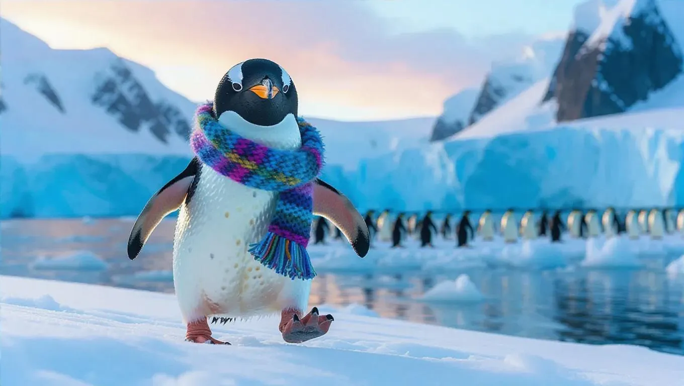 A playful penguin strides through the wintry terrains of Antarctica, its black and white coat contrasting vividly with the fresh snow. This penguin dons a fuzzy scarf and funky rubber boots, its actions adorably awkward. Surrounded by towering icebergs and glimmering frozen lagoons, the sunlight dances on the icy surfaces. In the backdrop, a small colony of penguins gathers closely, their calls echoing softly in the frosty air. The sky displays colors of magenta and teal, enhancing the scenic beauty.