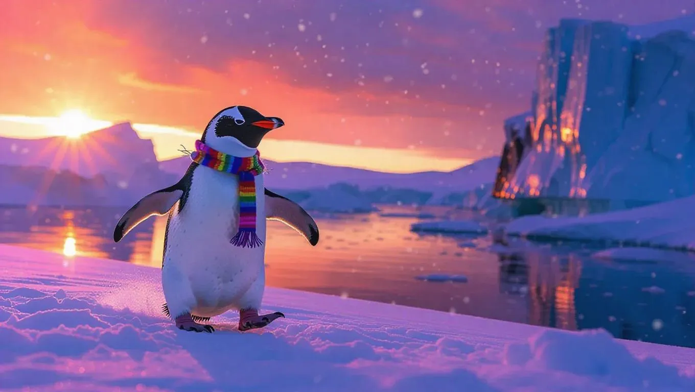 An entertaining penguin hops joyfully across the brisk, snowy scenery of Antarctica, its black and white body contrasted sharply by the sprawling white snow. This penguin sports a colorful scarf and funky aviator-style boots, shuffling clumsily yet adorably. Surrounding it are jagged ice formations and tranquil frozen lakes glistening in the sunshine. Just beyond, a congregation of snowflakes takes flight, adding a gentle whisper to the stillness. The sky flashes bright with oranges and purples, painting a vibrant canvas overhead.
