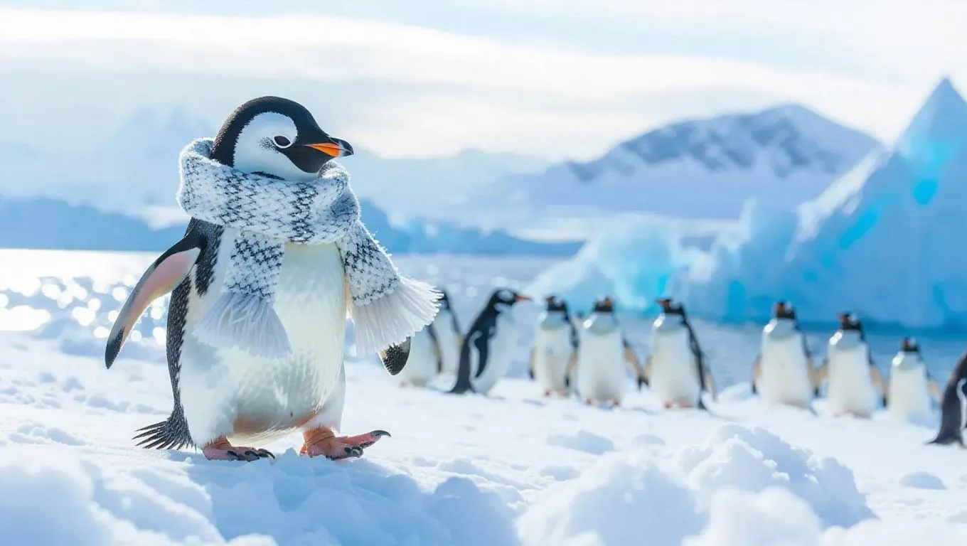 A quirky penguin rolls through the frigid Antarctic landscape, its black and white feathers highlighted beautifully by the white surroundings. It wears a fluffy scarf and oversized boots, its waddles comically endearing. Nearby, the vast expanse of icebergs and pristine frozen surfaces sparkle vividly in the sun's radiant light. In the distance, a cluster of nesting birds chirps softly, their melodies adding life to the cold air. The sky radiates a mix of cobalt and peach, enhancing the scene’s allure.
