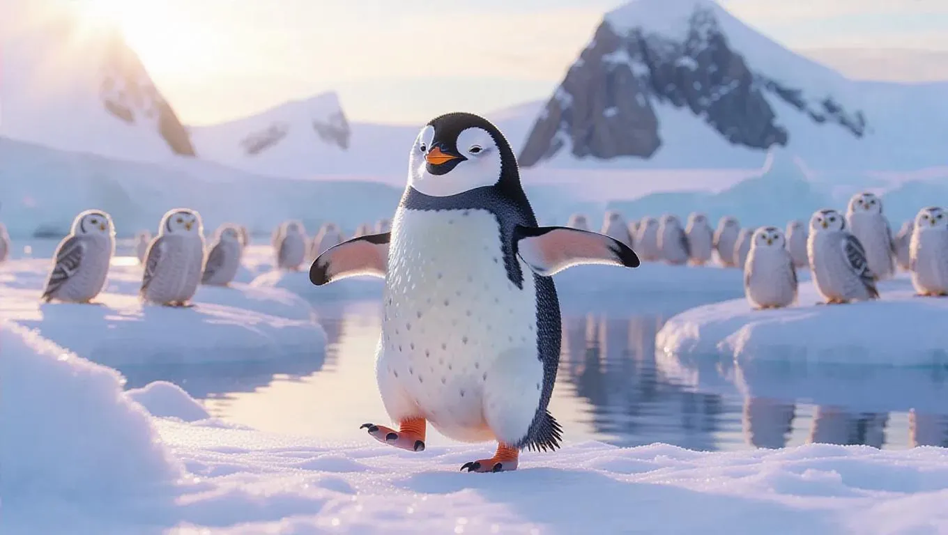 A bubbly penguin dances through the snowy terrain of Antarctica, its striking black and white features counterbalanced by the soft white snow. With a cool cap and brightly colored shoes, the penguin moves with a charmingly awkward grace. Surrounding it are colossal ice formations and still icy ponds, glimmering under the sunlight. In the background, a restless group of snowy owls hoots softly, adding to the wintery atmosphere. The sky softly transitions from tangerine to blue, highlighting the landscape’s beauty.