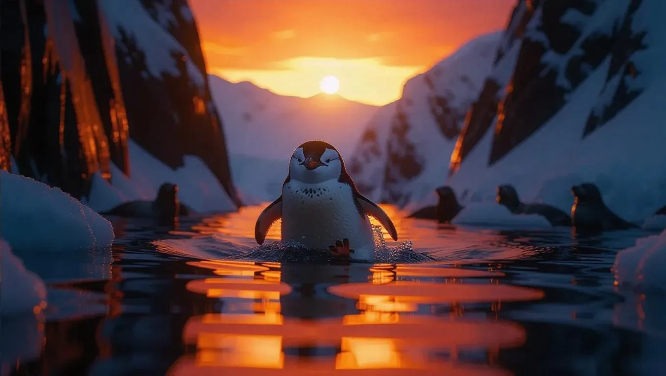 A spunky penguin tumbles through the frosty facets of Antarctica, its distinctive black and white plumage setting off against the backdrop of pure snow. Wrapped in a fuzzy scarf and curled-up boots, its movements are both chaotic and comically cute. Icy cliffs and mirror-like waters envelop the scene, glistening brilliantly under the sun. Nearby, a small crowd of seals basks lazily in the sunlight, their playful barks creating a joyful ambiance. The sky is painted with brilliant reds and yellows, adding a striking effect to the view.