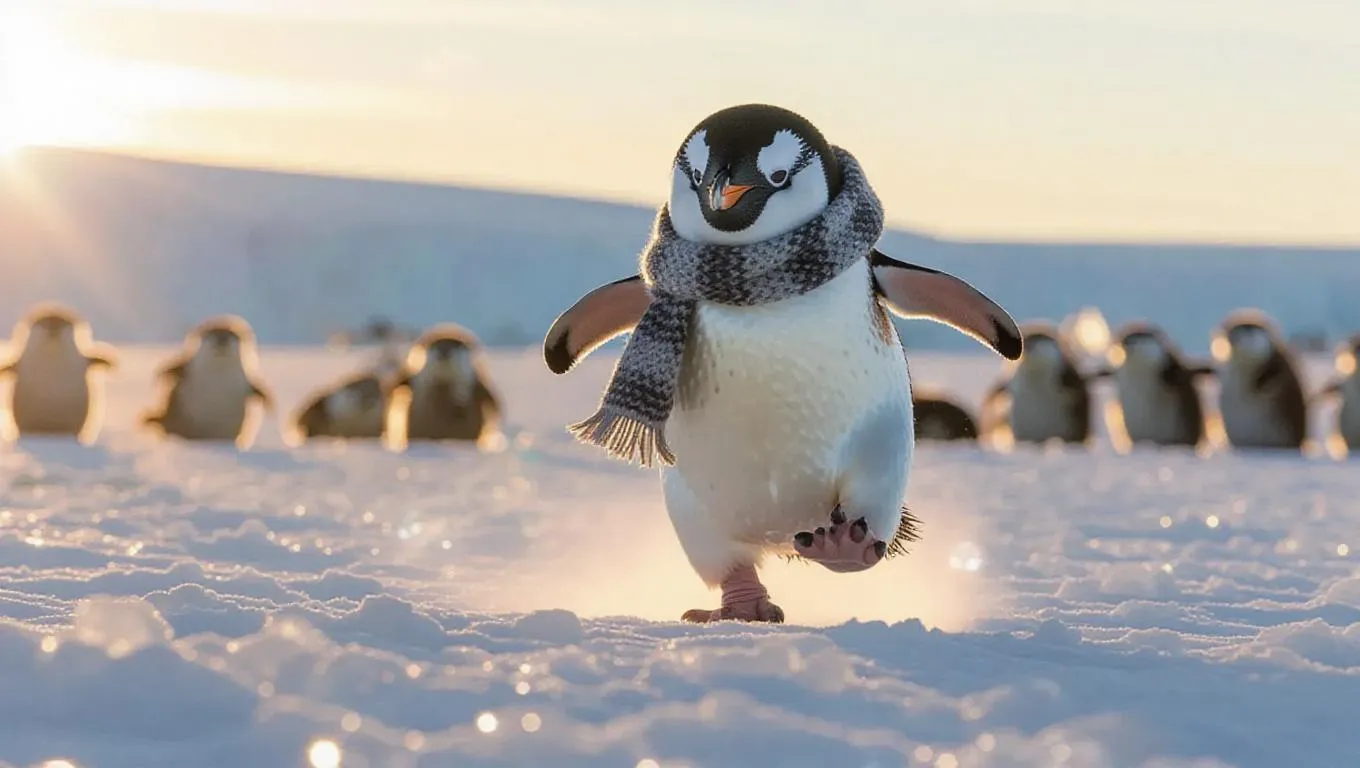 A mischievous penguin sprints across the frosty fields of Antarctica, its black and white feathers shining vividly against the blanket of white snow. Sporting a stylish scarf and little boots, its movement is both jerky and adorable. Surrounding it are magnificent glaciers and crystal-clear icicles glistening in the sun. At a distance, a handful of playful otters frolic together, their sounds harmonizing with the crispness of the air. The sky showcases warm tones of orange mingling with cool blues, resulting in an eye-catching landscape.