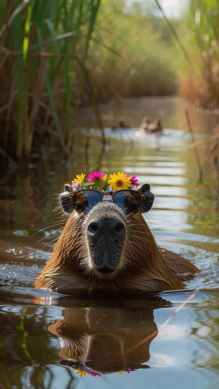 A playful capybara lounges in the warm waters of the Pantanal, Brazil, its large body floating effortlessly. The capybara wears a small flower crown and a pair of sunglasses, its eyes half-closed in relaxation. Around it, tall grasses and scattered trees line the riverbanks, their surfaces reflecting the sunlight. In the distance, a small group of birds takes flight, their calls echoing through the air. The air is warm and filled with the scent of earth and water.