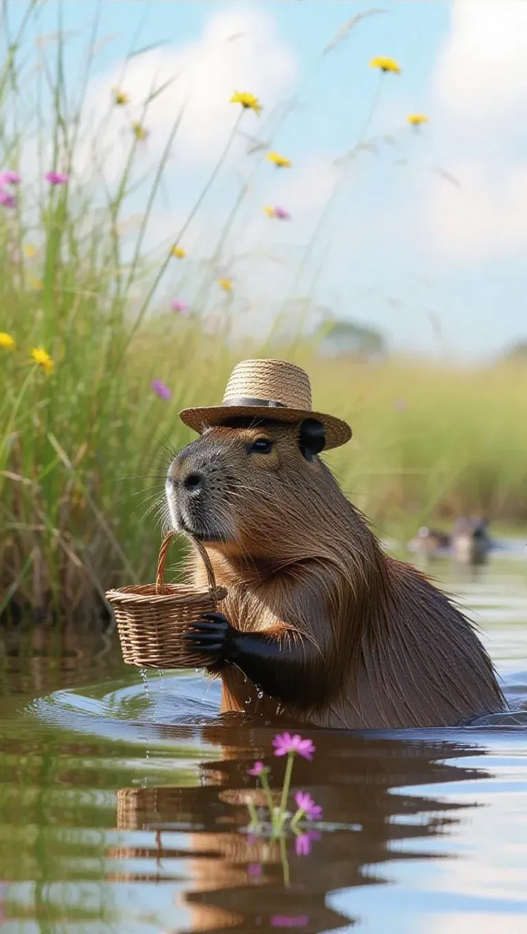 An inquisitive capybara explores the shallow edges of the Pantanal, Brazil, its sizable body cautiously moving through the water. The capybara wears a quirky hat and carries a small wicker basket, its eyes sparkling with curiosity. Nearby, tall grasses and colorful wildflowers bloom abundantly along the shore, their beauty enhanced by the sunlight. In the distance, a family of otters plays nearby, their splashes adding liveliness. The atmosphere is bright and fragrant with wild blooms.